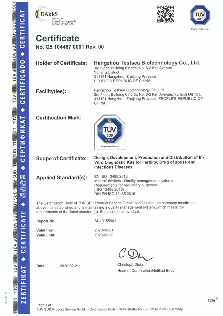 Als Hersteller von In-vitro Diagnostik ist für uns eine lückenlose Qualitätssicherung selbstverständlich. Dazu sind alle Prozesse, die in die Entwicklung und Herstellung einfließen, nach ISO13485 durch den TÜV Süd zertifiziert. Des Weiteren sind auch alle Management Prozesse nach ISO9001 zertifiziert, um die bestmögliche Qualität zu bieten. Alle Produkte sind CE Konform und werden weltweit vertrieben.